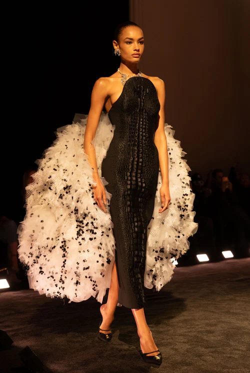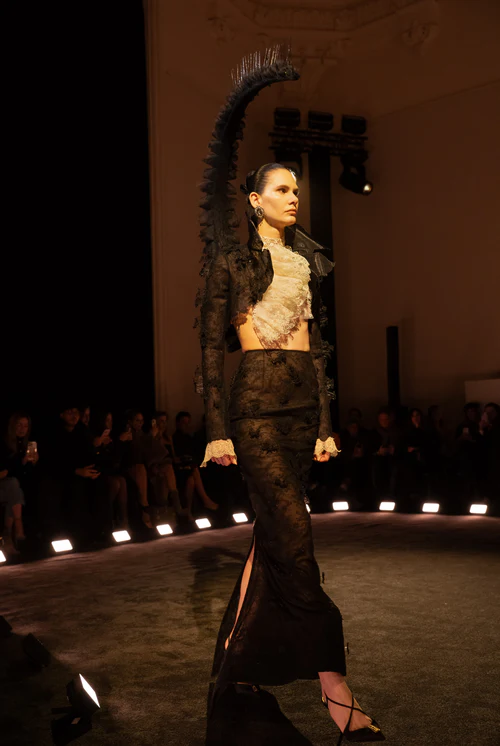 The result was both menacing and mesmerizing, much like the most effective hunters. A sheer black lace jacket swept into a dramatic curved scorpion tail, bristling with silver needles, while a crystal-embroidered skirt suit exploded into organza spikes inspired by the defensive armor of a blowfish. Fashion here functioned as both shield and strike.